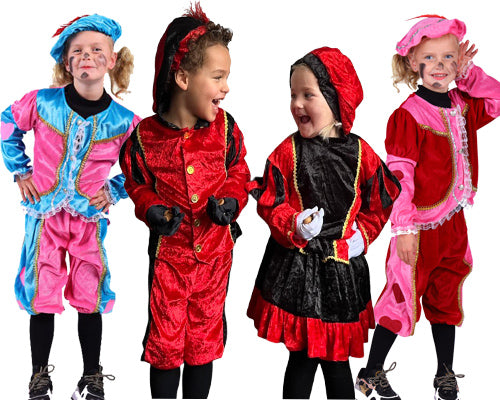 Diverse Pietenpakken voor kinderen, pietenpakken van eenvoudig tot luxe kinderpietenpakken, geschikt voor professioneel gebruik in zelfde kwaliteit als de volwassen Zwarte Pietenpakken. Een Pietenpak voor kinderen bestaat gewoonlijk uit een jas (soms met cape), broek en baret (soms met veertje). De goedkoopste Pietenpakjes zijn de satijnen pakjes en voornamlijk kleine maatjes, De pakjes van fluweel zijn ook beschikbaar in de grotere kindermaten, afgewerkt met luxe goudband. Voor de kinderpietjes hebben we ook een kleinere maillot, een kinderpietenpruik en alles pietenaccessoires het kinderpietje helemaal aan te kleden